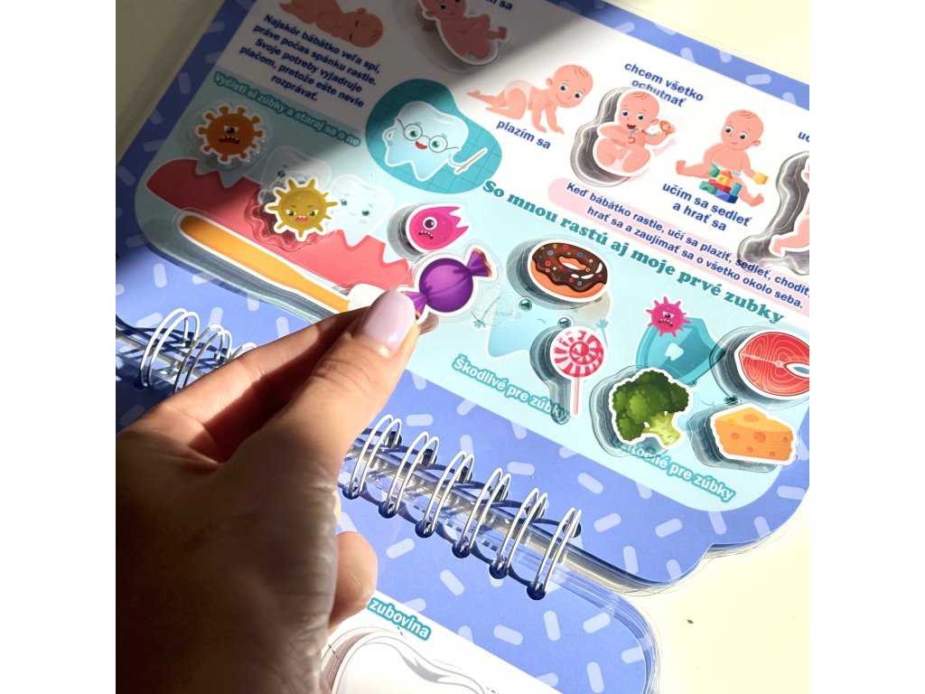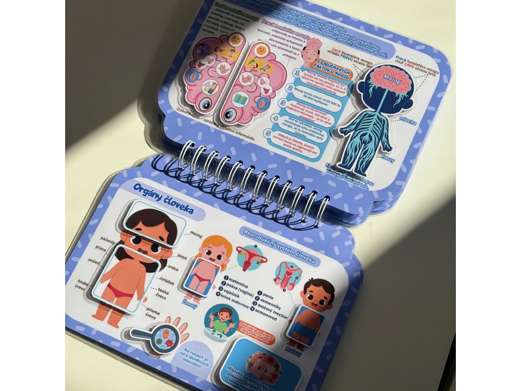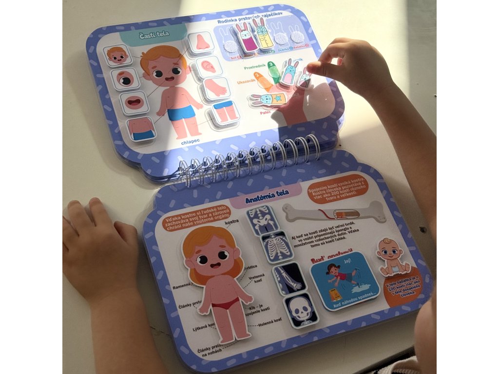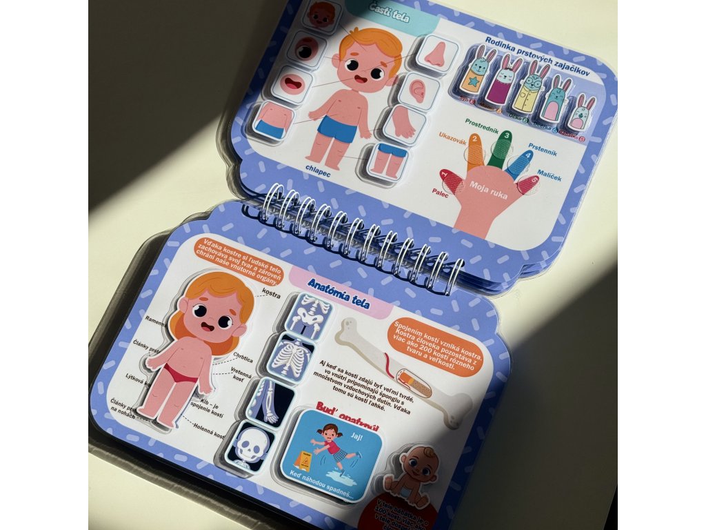 📖 Obsahuje 12 pracovných strán a až 93 pohyblivých dielikov, ktoré sa ľahko pripínajú vďaka suchému zipsu. Deti sa tak môžu zapojiť do rôznych aktivít – spoznávať časti tela, zmysly, orgány, kostru či emócie.